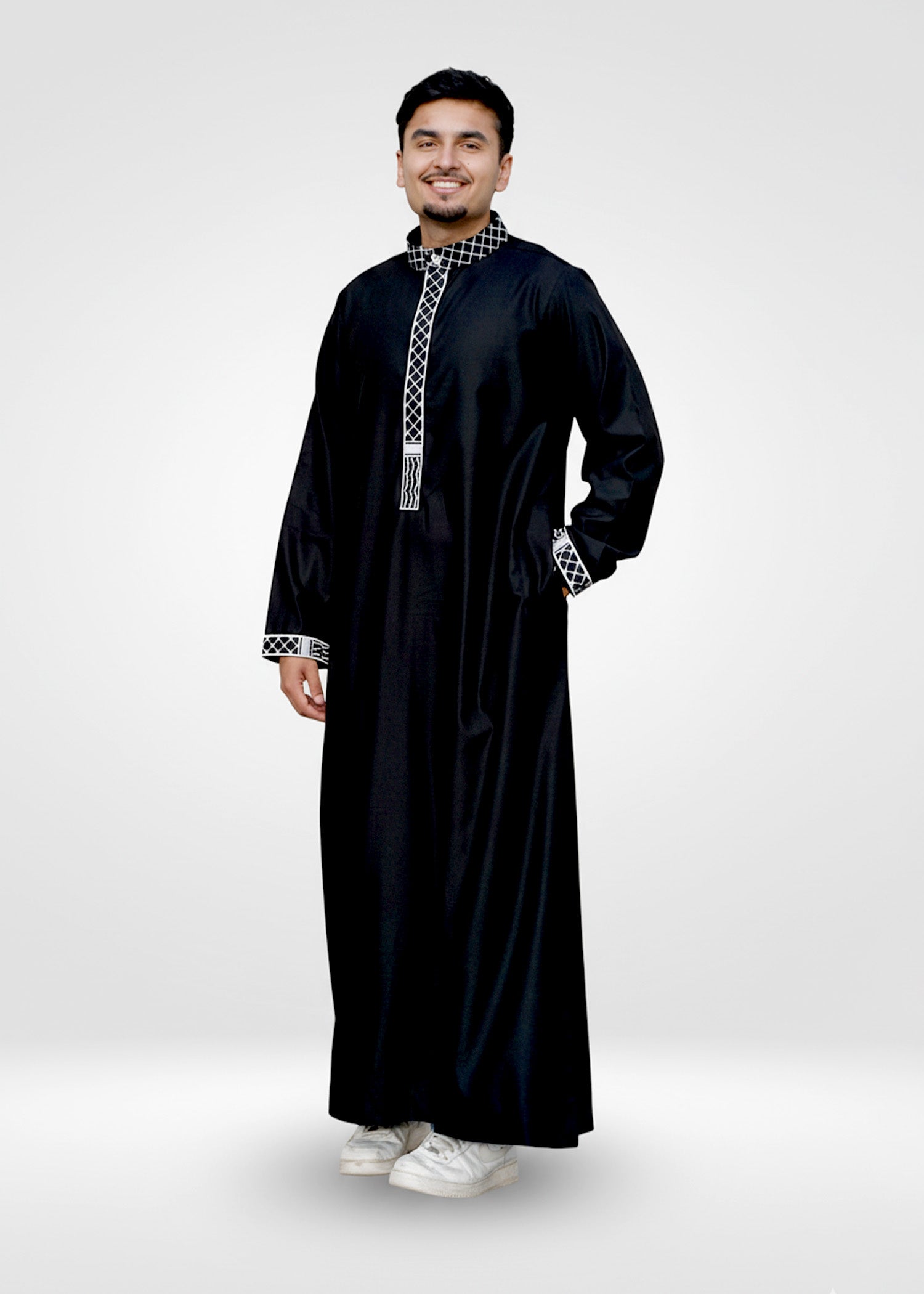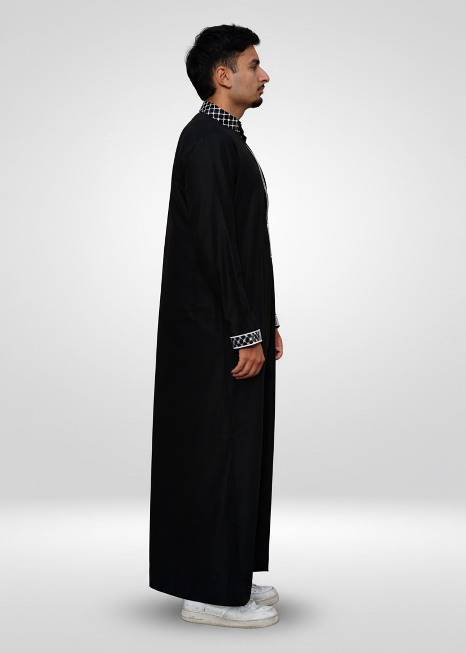 This thobe features a deep, opaque black fabric that serves as a sophisticated canvas for the intricate white & black Kufiya (Keffiyeh) embroidery. The geometric checkered pattern details the mandarin collar, front placket, and cuffs, creating a distinguished look that honors Palestinian history. Designed to match our Kids' collection, it is the ultimate choice for a meaningful Father-and-Son ensemble for Eid, cultural events, or Jumu'ah prayers. Whether you are in Michigan, New Jersey, or California, enjoy fast nationwide delivery straight to your door.