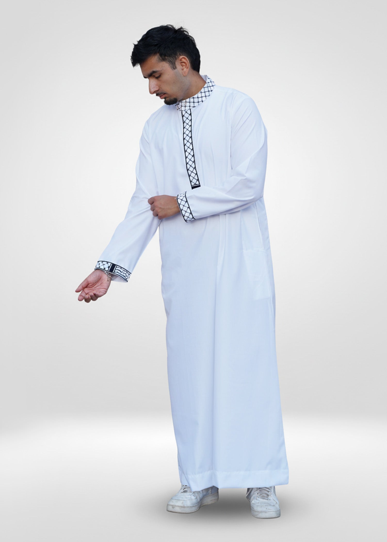 This thobe stands out with its intricate black embroidery inspired by the traditional Kufiya (Keffiyeh) scarf, detailing the mandarin collar, front placket, and cuffs. The bold black geometric pattern creates a striking contrast against the pristine white fabric, making it a powerful statement piece for Eid, cultural events, or Jumu'ah prayers. Crafted from our signature soft-touch, wrinkle-resistant blend, it offers a dignified fit that honors both faith and history.