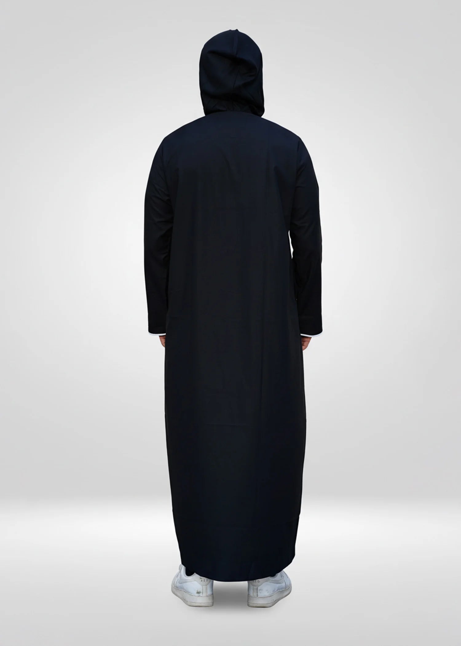 This thobe stands out with its solid black silhouette, accented by clean white piping along the hood and cuffs for a sharp, athletic look. The integrated hood and smooth zipper make it a practical choice for the gym, running errands, or casual prayers. Designed to match our Kids' collection, it offers a cool, coordinated look for you and your son to rock together. Whether you are in New York, California, or Texas, enjoy fast nationwide delivery straight to your door.