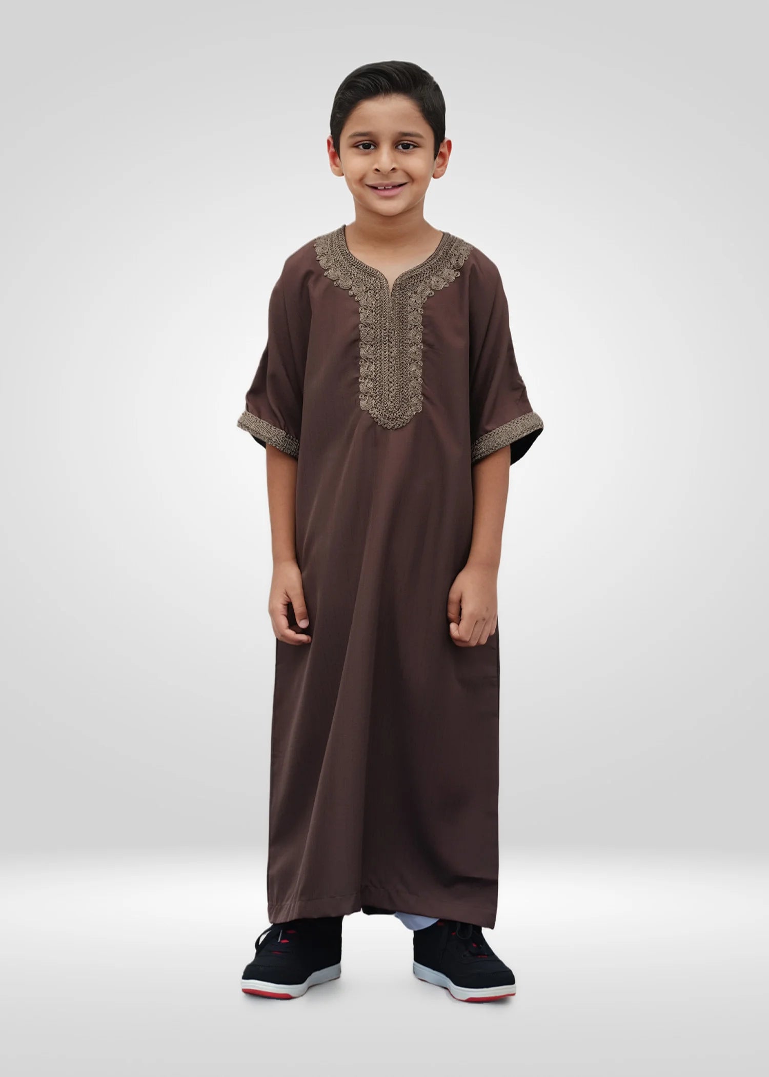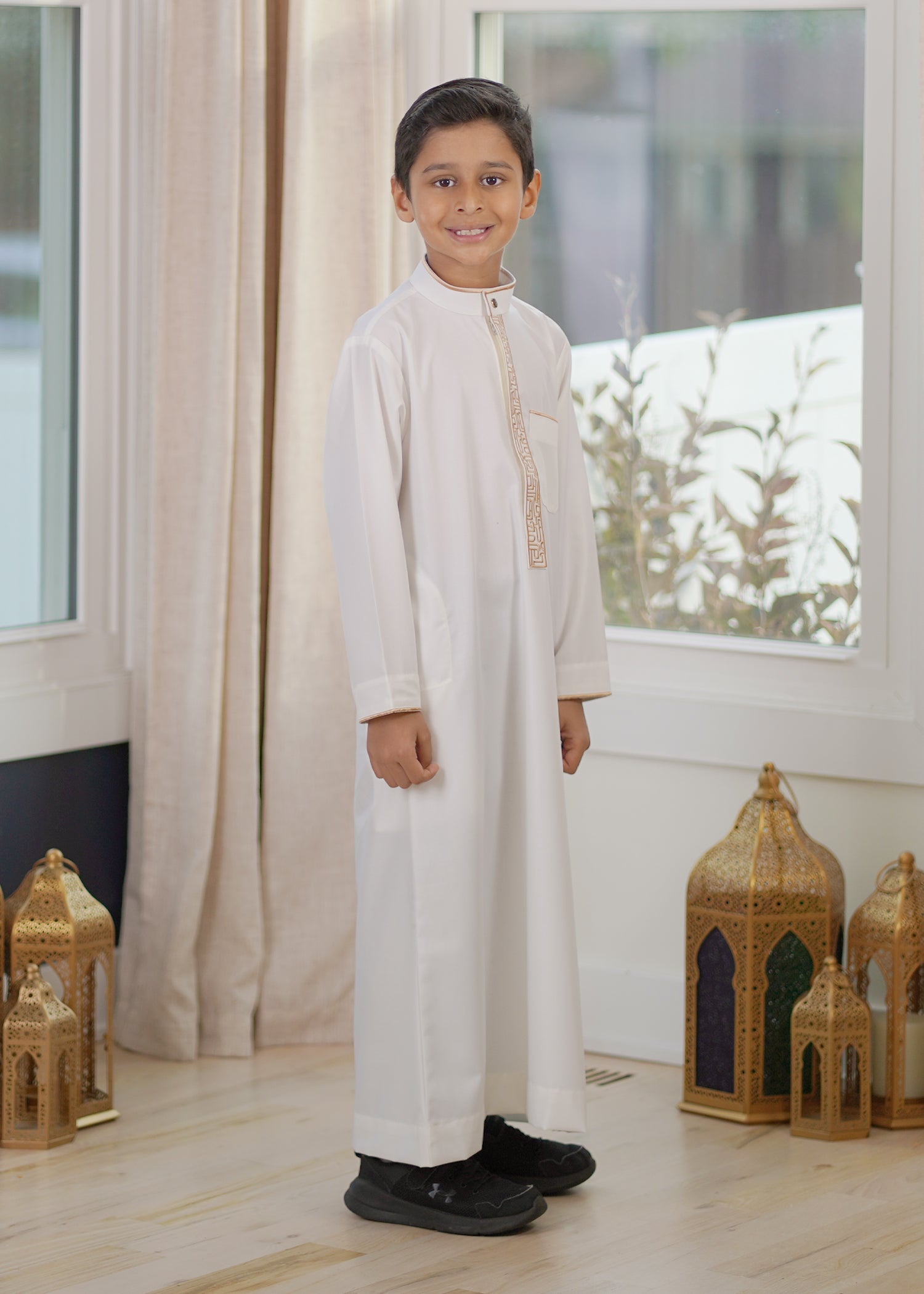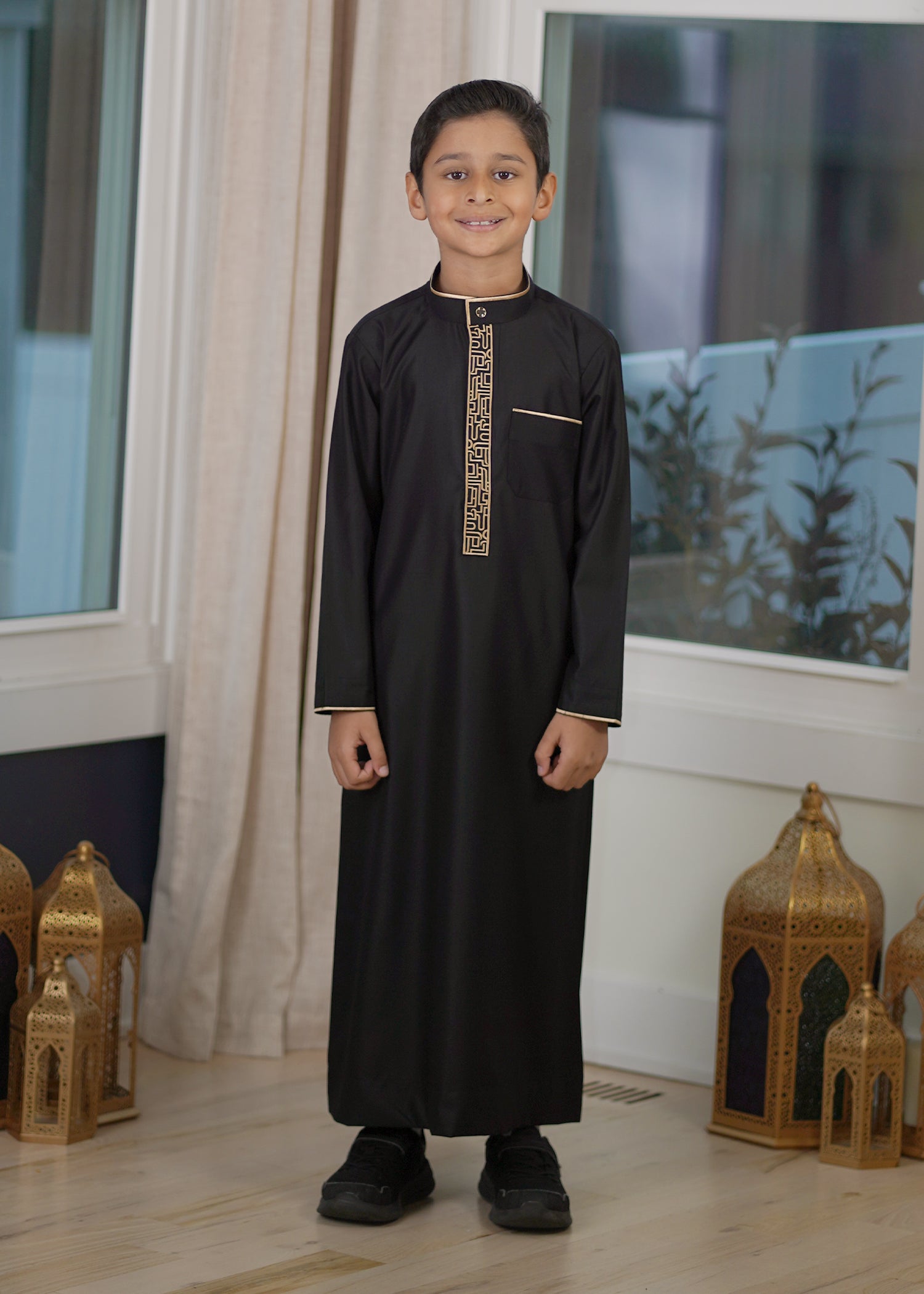 When it’s time to celebrate — Eid, weddings, or a family gathering — our embroidered kids' thobes bring that special touch. Clean designs, striking colour contrasts like navy/gold or gray/black — just enough flair to keep things modest and memorable.