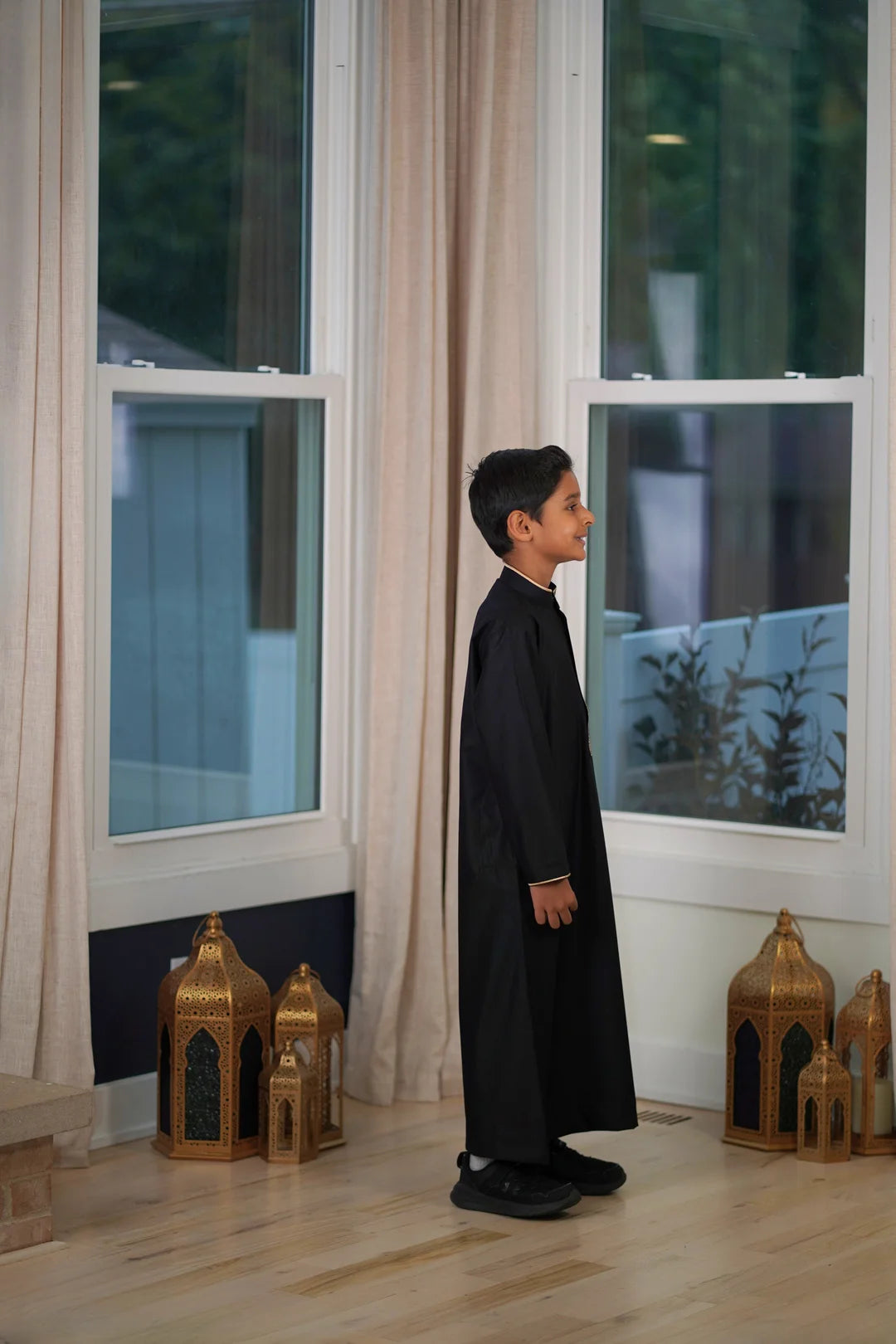 This thobe exudes royalty. The deep, opaque black fabric serves as a sophisticated canvas for the striking gold embroidery that details the neckline and placket. Whether standing shoulder-to-shoulder for Eid prayers, attending a wedding, or capturing family portraits, this matching style ensures your son looks just as distinguished as his father. Crafted from our signature soft-touch blend, it offers the perfect mix of formal elegance and all-day comfort.
