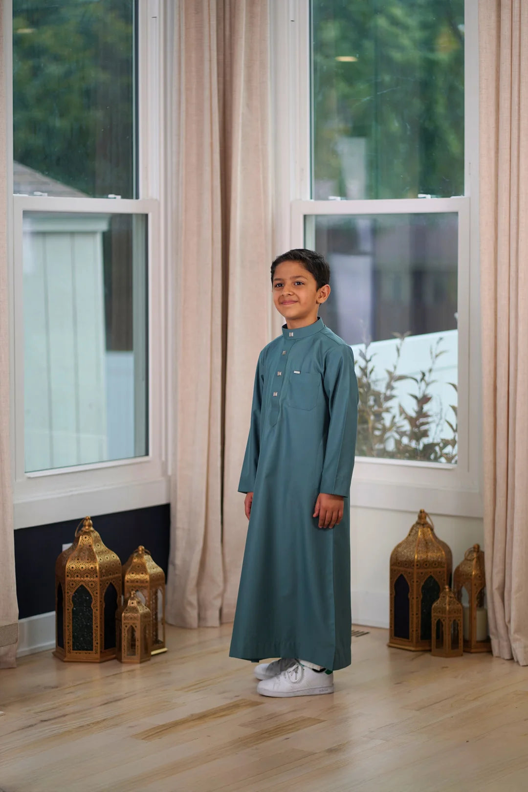 Moving away from standard monochromes, this rich slate green shade provides a distinguished look that stands out while remaining perfectly modest. Expertly crafted from a soft-touch blend, this thobe is breathable, resilient against wrinkles, and built to last. Whether it's for Madrasah, daily prayers, or a family gathering, this jubba ensures your child looks his best without compromising on comfort.