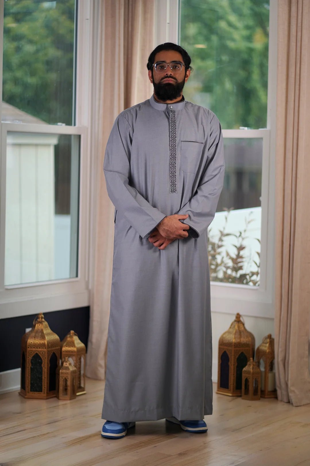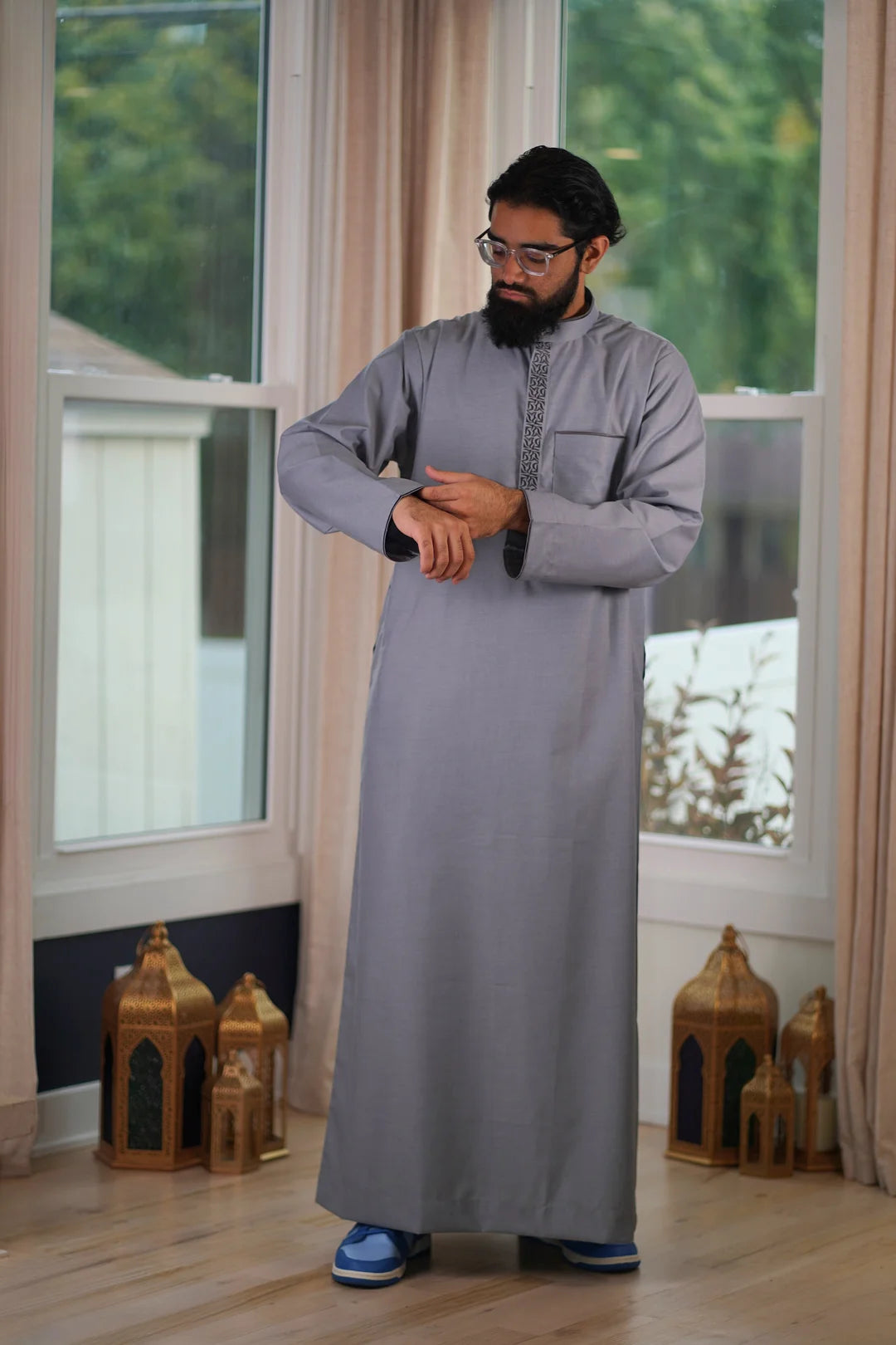 Gray & Charcoal Embroidered Thobe | Premium Men's Mandarin Collar Jubbah