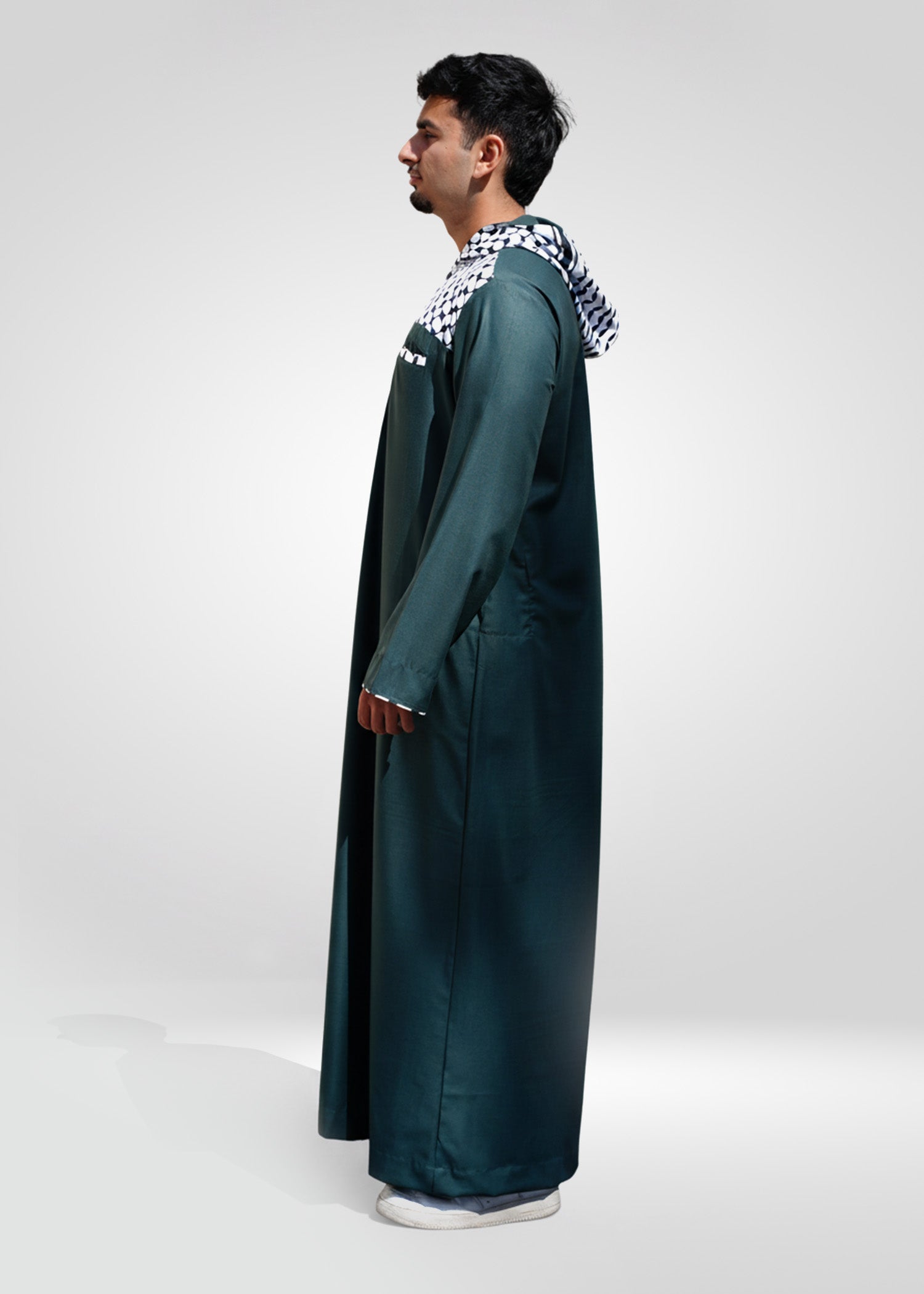 This thobe features a deep, sophisticated forest green shade, a color that symbolizes growth and peace. The chest and hood are detailed with the iconic black and white Kufiya (Keffiyeh) pattern, creating a striking contrast that honors Palestinian culture while keeping you on-trend. With its relaxed fit and functional hood, it is the perfect choice for the modern Muslim man who values both tradition and individuality.